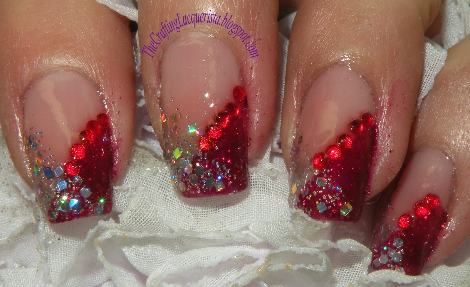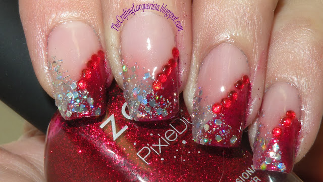 My next mani is my Christmas mani this year and I have to say I really love it! For this manicure I used the same technique but I added rhinestones! The red is +Zoya Nail Polish & Treatments pixie dust in Chyna and the silver glitter is Hard Candy Celebrate Sequins. I then added red rhinestones to the edge! I also used Gothic Gala Lacquers "Smooth me Over" to help keep the rhinestones in place!