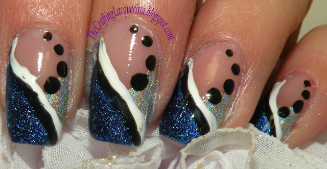 This looks was very simply achieved by one stroke of silver diagonally up my nail and then one stroke of Zoya in Dream diagonally in the other direction. Then I just did two simple squiggles one in white and one in black. I finish it off with a dotting tool and some Seche on top!