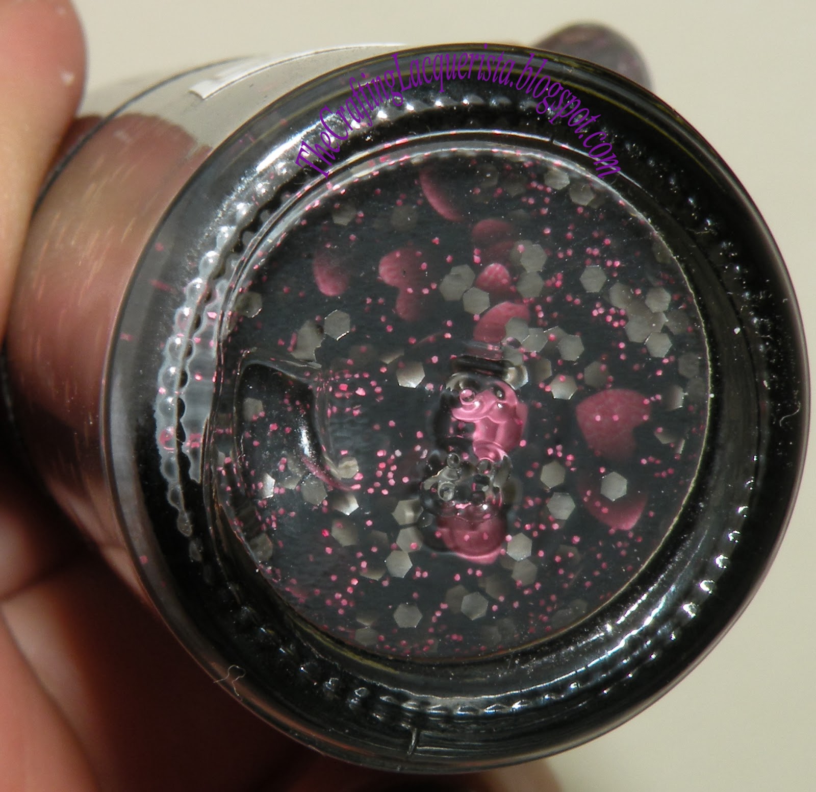 Anywho ... Tonight I am going to share with you yet another Lucky 13 Lacquer. I try to space out my reviews of polishes but I am just too excited about this one. Companion Cube is such an amazing polish. It is described as a "Grey jelly base with tiny pink, medium silver, and pink hearts" Now if I have not made it clear already I hate fishing for glitters with a passion. However for this one I actually dug out a toothpick to fish a bit. I have had this bottle sitting on my shelf for quite some time so getting the hearts out was a bit of a pain. I did have it flipped upside down for a while but I got impatient. I was only patient enough to fish out one heart glitter for each hand but I am sure that next time when I have more time in advance and let it sit for longer the hearts will be less of a butt.