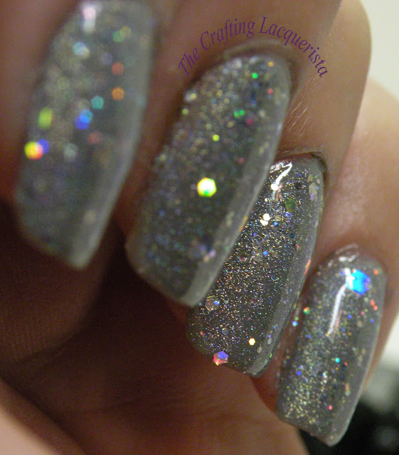 Now here is Sweater Weather with Frosted as a top coat! Frosted could very well be a stand alone polish but the maker describes it as such - "Frosted is packed full of all things holo! Tons of holo glitter and a touch of holo pigment make this a stunning top coat!" My swatches below show only one coat of Frosted over sweater Weather with a single coat of Seche Vite. The last picture is purposely out of focus to highlight the amount of sparkle this top coat has!