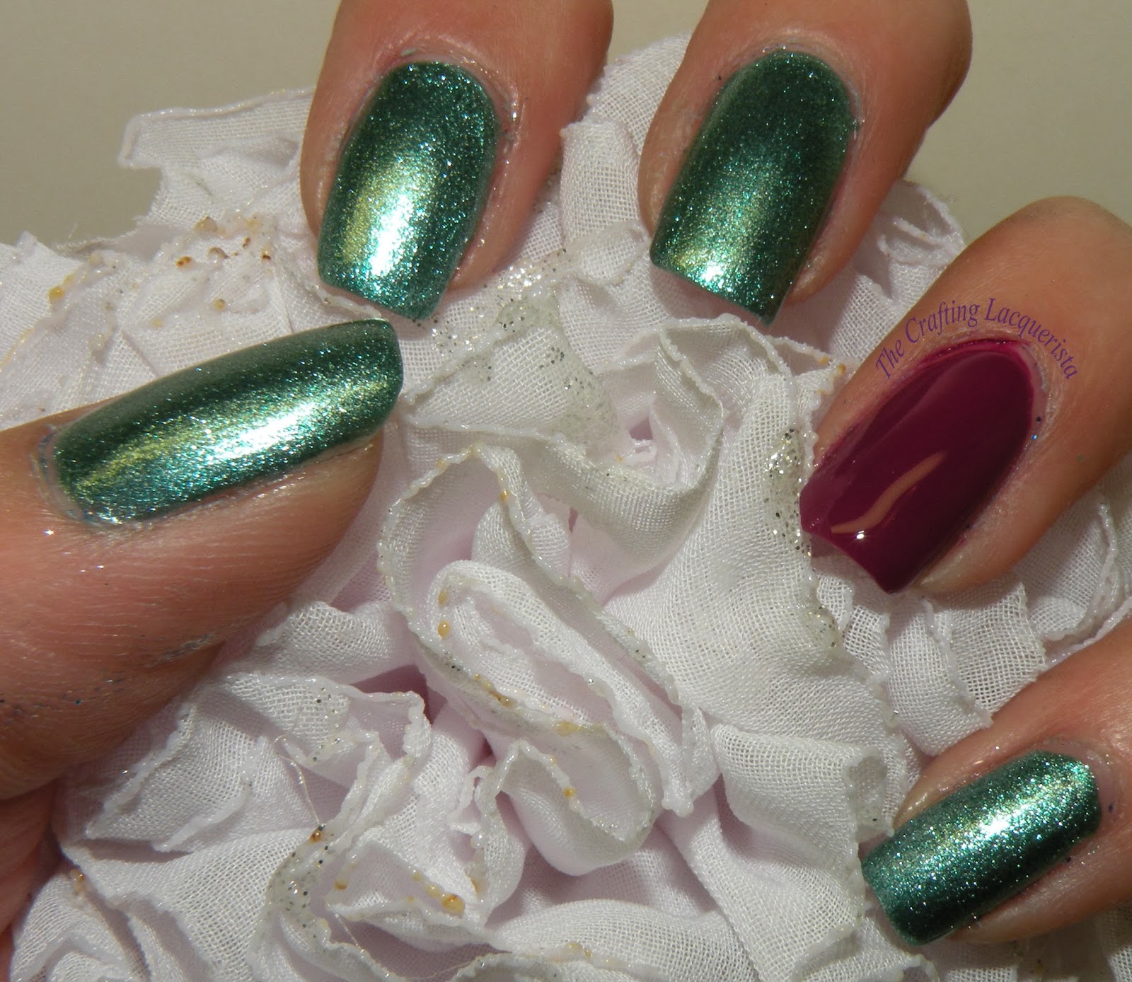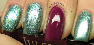 So today to go along with my Julep rant I present to you Ceila and Evelyn. Evelyn is a beautiful plum red cream polish and Evelyn is shimmery metallic blueish green. I decided to use Evelyn as my main polish color and Ceila as an accent to save myself some time. it is very late and I don't want to prolong this post too very much. My swatches show two coats of each with a seche topcoat!